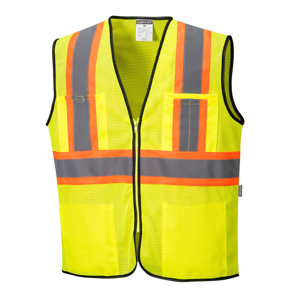 This vest uses lightweight, cooling mesh fabric, with a zipper fastening. It includes 2 external chest pockets, 2 internal patch pockets and contrast reflective tape design.